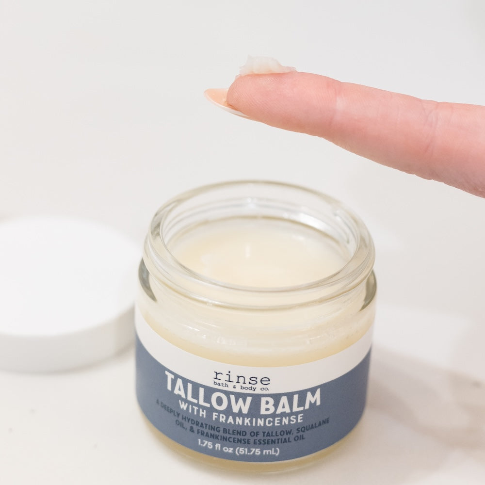 Our Tallow Balm is crafted with the highest quality natural ingredients: Adeps Bovis (100% Grass-fed, Organic Beef Tallow), Squalane (derived from the Olivel,) & Boswellia Carterii (Frankincense) Essential Oil. The Tallow is similar to your skin’s natural oils and is packed with essential vitamins, fatty acids like oleic acid and linoleic acid, and antibacterial properties. The Squalane works the same way- it mimics your skin's natural lipids, helping to lock in moisture without clogging pores. Finally, the Frankincense Essential Oil is great for fine lines & scarring. All 3 make this magical moisturizer a skincare must-have.